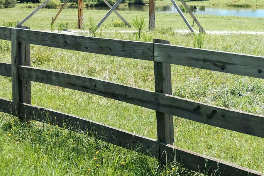 The fence is constructed with a rail that runs horizontally along the top between fence posts. This style of construction creates a stronger, more supportive structure.